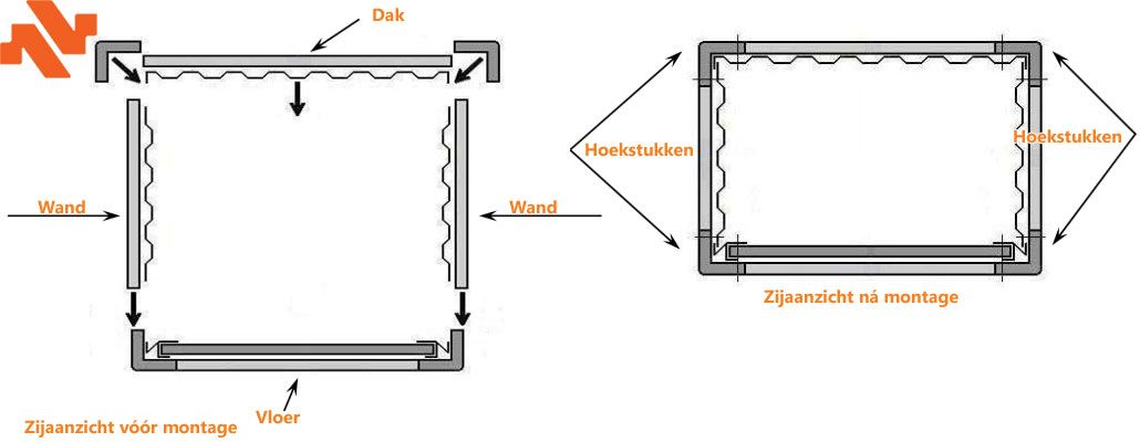 5. Monteer beide zijwanden in de horizontale stalen steunen (V-vormig) op de bodem, zet ze in verticale positie en schroef ze vast door de hoekstukken aan de vloer. LET OP! De panelen dienen zo te worden bevestigd, dat het bovenste profiel het onderste aan de buitenkant overlapt (naar de vloer, gelabeld met 'This Side Down'). Doe je dit niet, dan komt er water in de container!
