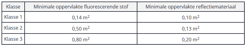 Het is echter wel mogelijk om van klasse 2 een klasse 3 te maken. Dit kun je namelijk bereiken door twee kledingstukken van klasse 2 aan te trekken. Op warme dagen kun je zo een RWS-vest klasse 2 combineren met een korte broek RWS klasse 2. Zo voldoe je toch aan alle eisen. De oppervlakte-eisen met betrekking tot signaalkleding zijn als volgt:
