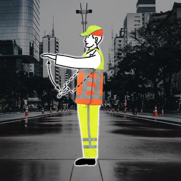 Verkeersregelaar met rechterarm recht omhoog: dit is een algemeen stopteken