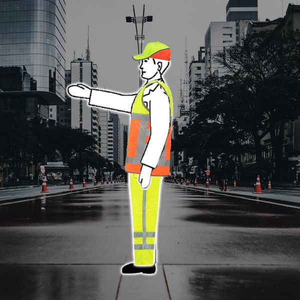 Verkeersregelaar met linkerarm opzij: stopteken voor verkeer dat de verkeersregelaar van voren nadert