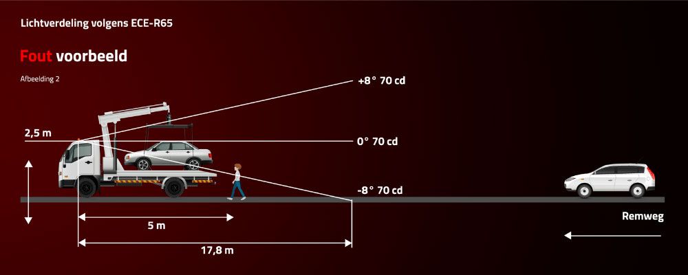 Voorbeeld goed: Een zwaailamp is 4 meter hoog gemonteerd. Iemand van 1,80 meter lengte kan het licht dan op 15,7 meter afstand nog goed zien, zelfs onder een hoek van -8 graden.