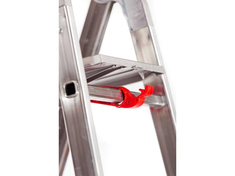 Zeer handig Je kunt aan dit trapje merken dat over alles is nagedacht. Zo is het aan de bovenkant uitgerust met een gereedschapsbakje. Ideaal voor je schroeven en spijkers. En dat niet alleen, onder dit bakje bevindt zich ook nog een emmerhaak. Ideaal voor schilders of glazenwassers dus! En dankzij de uitsparing in het bakje, is deze trap gemakkelijk hanteerbaar.