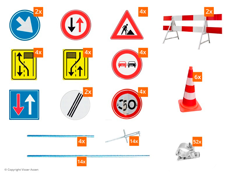 - Opstelmasten van 3 meter met slagpotten voor verkeersborden.