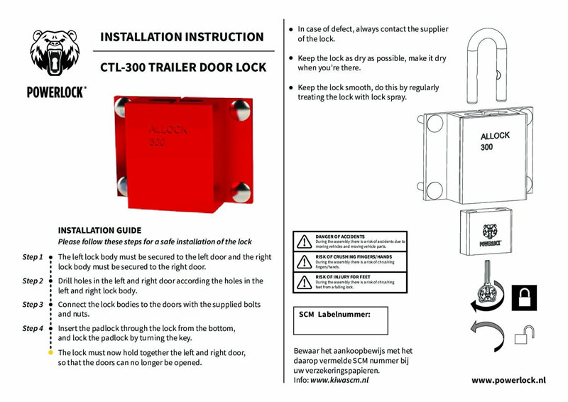 Het PowerLock CTL-300 containerslot wordt stevig bevestigd aan beide deuren van je container of trailer met roestvrijstalen M10 bouten. Hierdoor krijg je een onwrikbare bevestiging die bijzonder moeilijk te doorbreken is.