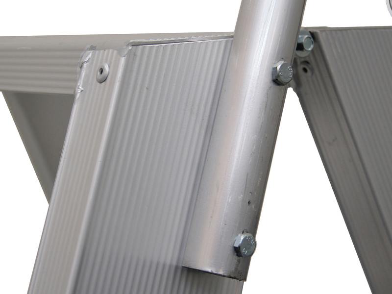 Bij deze trap hoef je je beslist geen zorgen te maken over de kwaliteit en de veiligheid, want deze zijn absoluut gewaarborgd. Want zoals je van onze topproducten mag verwachten, is deze dubbele trap van Solide opgebouwd uit de allerbeste materialen. Bovendien wordt deze trapladder standaard uitgeleverd met een bij professioneel gebruik verplichte veiligheidsbeugel. Deze hoef je alleen nog maar met de vier meegeleverde bouten in de voorgeboorde gaten te monteren. Extra veiligheid biedt ook het tweede scharnierplatform waarover deze trap beschikt. Hiermee is het uitgesloten dat deze trapladder zal spreiden of toeschuiven. Al deze eigenschappen maken deze dubbele trap toepasbaar voor industrieel gebruik.