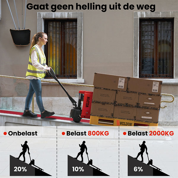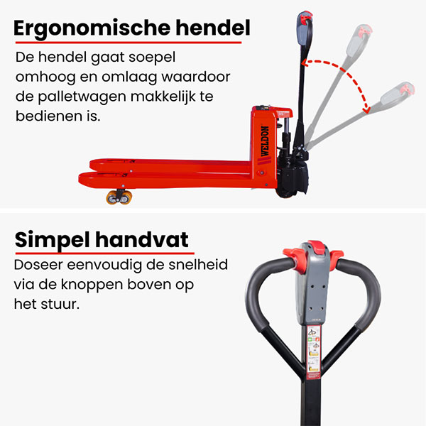 De WPE 2000 is uitgerust met een borstelloze motor, wat betekent dat je geen tijd en geld hoeft te besteden aan het vervangen van koolstofborstels, zoals bij traditionele palletwagens. Hierdoor kun je rekenen op langdurige prestaties zonder extra onderhoudskosten. Met een vermogen van 750 W tot 1000 W is deze transpallet in staat om zware ladingen zelfs op hellingen te verplaatsen. Of je nu werkt in een magazijn, logistiek centrum of supermarkt, de WPE 2000 is jouw betrouwbare partner.