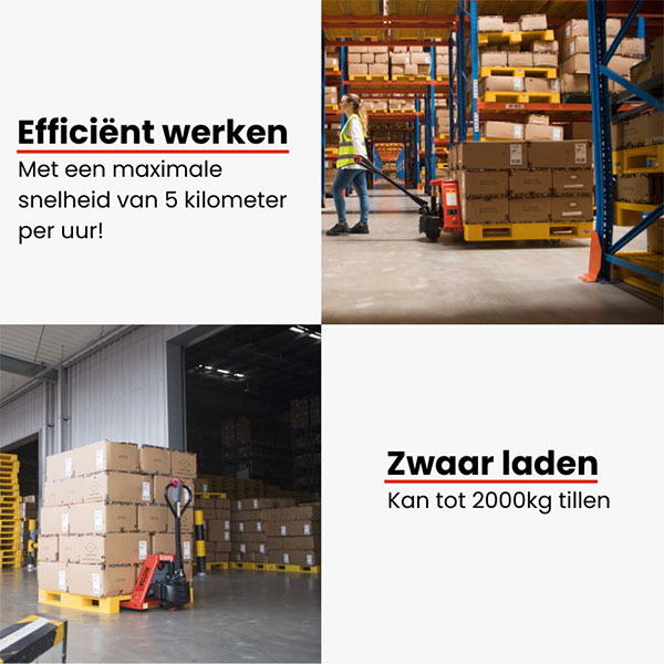 Ben je op zoek naar een krachtige en betrouwbare elektrische palletwagen die je werk efficiënter maakt? De WPE 2000 kg elektrische palletwagen is de ideale keuze! Met zijn geavanceerde technologie en robuuste constructie is deze palletwagen perfect voor het tillen en verplaatsen van zware ladingen tot wel 2000 kg. Dankzij de onderhoudsvrije, borstelloze motor biedt de WPE 2000 niet alleen kracht, maar ook duurzaamheid en lage onderhoudskosten.