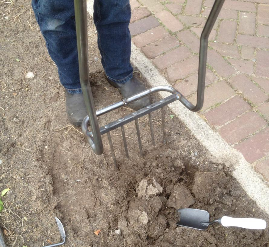 Deze woelvork laat je de grond bewerken zonder een zware inspanning te hoeven verrichten. Met de Grelinette is het namelijk mogelijk om de grond te bewerken zonder dat je deze hoeft om te spitten. Dankzij de ergonomische vormgeving met hefboomeffect van deze gazonbeluchter werk je dan ook snel en efficiënt zonder moe te worden. Bovendien heb je geen last van rugpijn meer na het spitten. De Grelinette stelt je in staat om bijna geheel rechtop de grond te verluchten en te verkruimelen zonder je rug te hoeven buigen.