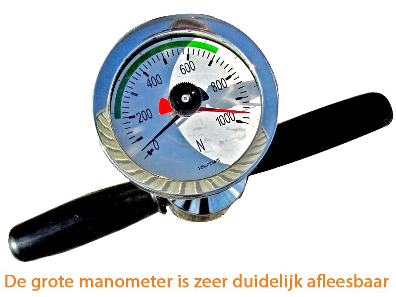 De weerstand die aan de conus wordt gemeten, kan worden afgelezen van de drukmeter. Deze wordt weergegeven met een zwarte wijzer. De rode hangwijzer geeft juist de maximale weerstand die tijdens de meting wordt afgelezen aan. De weerstand tegen penetratie (kPa/cm2) van de bodem kan nu worden bepaald door de uitleeswaarde te delen door het oppervlak van de conus.