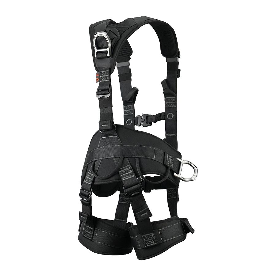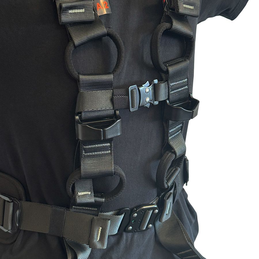 - Veilige bevestigingspunten: twee geïntegreerde valbeveiligingspunten, waaronder textiele lussen op de borst en een aluminium D-ring op de rug voor solide verankering.