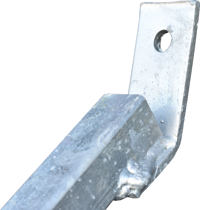 Zoals hierboven al is vermeld, is deze kalkzandsteenschoor uitgevoerd met twee vaste voeten van 125 bij 40 mm. Deze twee aangelaste voeten zijn beide in een hoek van exact 45 graden aan de lijmschoor gelast. Deze voeten steken aan weerszijden 65 mm uit en zijn voorzien van een gat van 14 mm. Hiermee kun je de kalkzandsteenschoor in een exacte hoek van 45 graden bevestigen aan zowel de vloer als de kalkzandstenen muur.