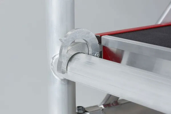Veiligheid staat voorop bij de Altrex RS 44-Power. De steiger is voorzien van rubberen loopvlakken op de Ø 150 mm wielen, waardoor hij geschikt is voor gebruik binnenshuis zonder krassen of beschadigingen achter te laten. Bovendien is de steiger uitgerust met een houten platform, wat zorgt voor een stevige en stabiele werkomgeving.