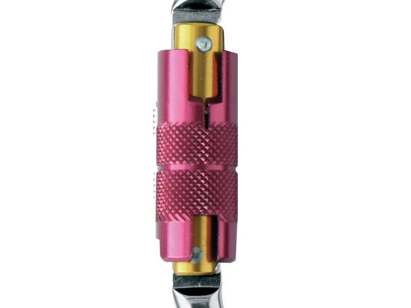 Met dubbele autotwistlock Deze karabijnhaak is uitgerust met een zogeheten dubbele autotwistlock-sluiting. Hiermee kun je iemand veilig en snel zekeren.