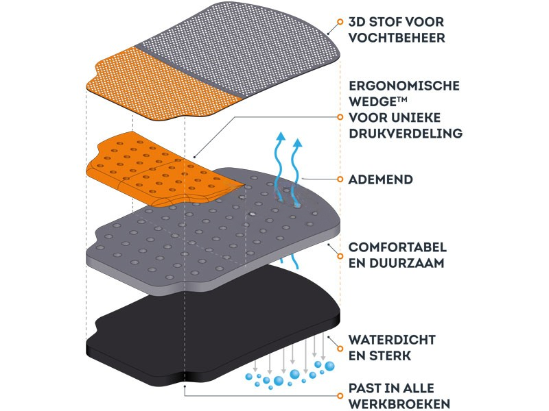 Deze knielappen voor in je werkbroek zijn speciaal ontworpen om een maximaal draagcomfort te garanderen. De FENTO POCKET biedt je knieën en je onderbenen zowel ondersteuning als bescherming. Dit komt omdat deze kniestukken een eenvoudig, maar bijzonder principe hanteren: comfort door middel van natuurlijke drukverdeling. De unieke 'wedge' ondersteunt het onderbeen en brengt de drager tot de juiste lichaamshouding. De knee pad biedt bovendien veel zitcomfort en voorkomt daadwerkelijk klachten aan zowel je rug als je knieën.