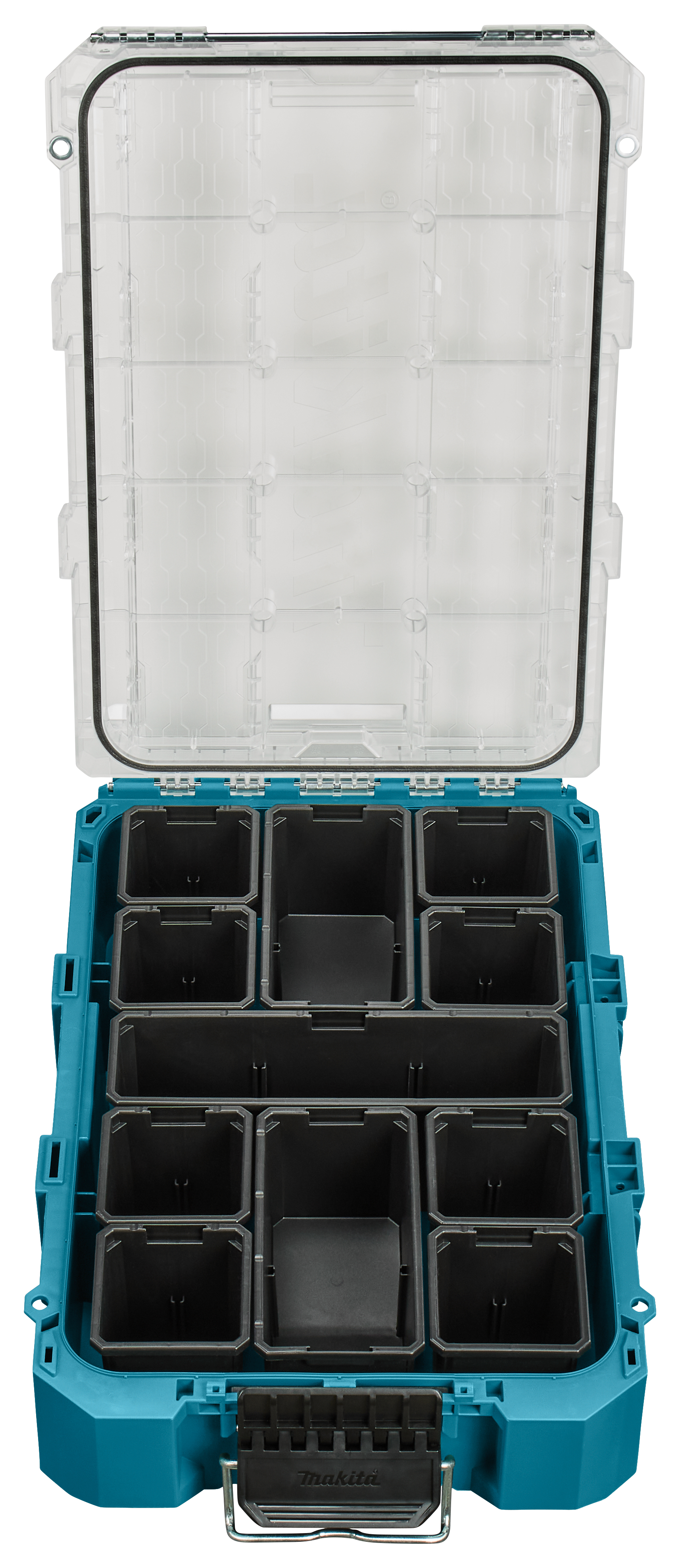 De Makita MAKTRAK Organizer Compact is een stevige en modulaire opbergkist, speciaal ontworpen om bevestigingsmateriaal, fittingen en klein gereedschap overzichtelijk te bewaren en mee te nemen. Ondanks het compacte formaat biedt deze organizer een inhoud van 8,55 liter en is hij gemaakt van een slagvaste copolymeer (PP-C) voor langdurig gebruik.