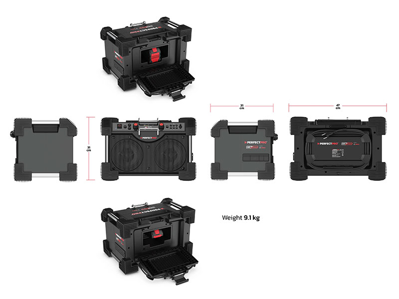 De PerfectPro RockHart RH4 is de ultieme bouwradio voor professionals die werken met 18V-accu’s van Bosch Blauw, Milwaukee, Makita en DeWalt. Dankzij de twee 30W-speakers en de ruime klankkast wordt muziek krachtig en helder verspreid over een groot oppervlak, tot wel 1.000 m². DAB+ en FM-radio met RDS zorgen voor storingsvrij geluid en zes snel oproepbare voorkeuzezenders. Daarnaast biedt de RockHart RH4 veelzijdige connectiviteit met Bluetooth-streaming en een aux-ingang voor mp3-spelers. De unieke Stereo Pairing-functie maakt het mogelijk om twee PerfectPro-radio's draadloos te koppelen voor een nog breder stereogeluid. Extra handig is de microfooningang, waarmee de radio ook als megafoon kan worden gebruikt. Bovendien functioneert deze robuuste werkradio als powerbank voor het opladen van mobiele apparaten. De RockHart RH4 combineert krachtig geluid met ultieme flexibiliteit, perfect voor de professionele bouwvakker.