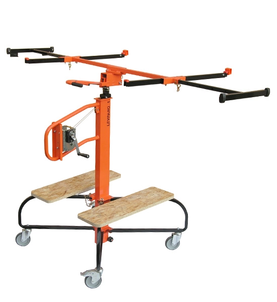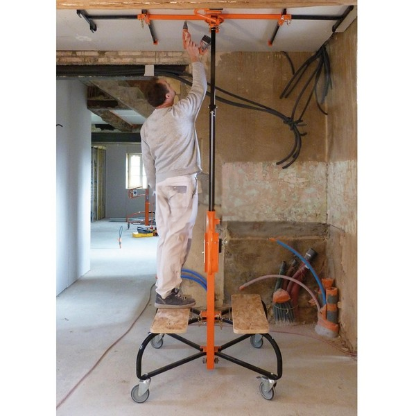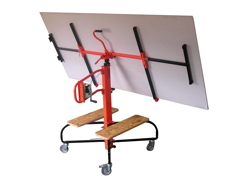 Naast een veilige platenlift, is deze plafondplatenlift ook zeer gebruiksvriendelijk. Zo is Model 1 extra stabiel door de vierbenige basis met grote, geremde wielen. Ook handig zijn de twee montagebankjes op de voet van de platenlift. Hiermee is deze plafondplatenlift het ideale ergonomische hulpmiddel voor het monteren van gipsplaten tegen plafonds en schuine wanden. En dat op een maximale hoogte van maar liefst 4.5meter!