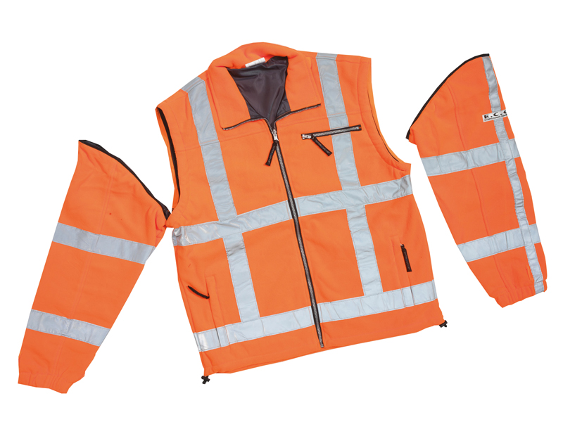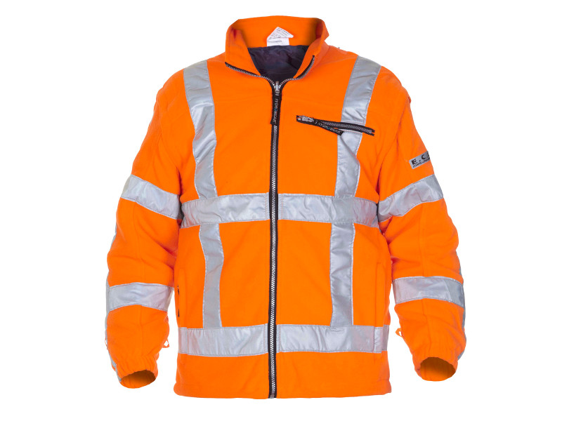 Dit fleecejack heeft een feloranje kleur. Het is echter ook in felgeel verkrijgbaar.