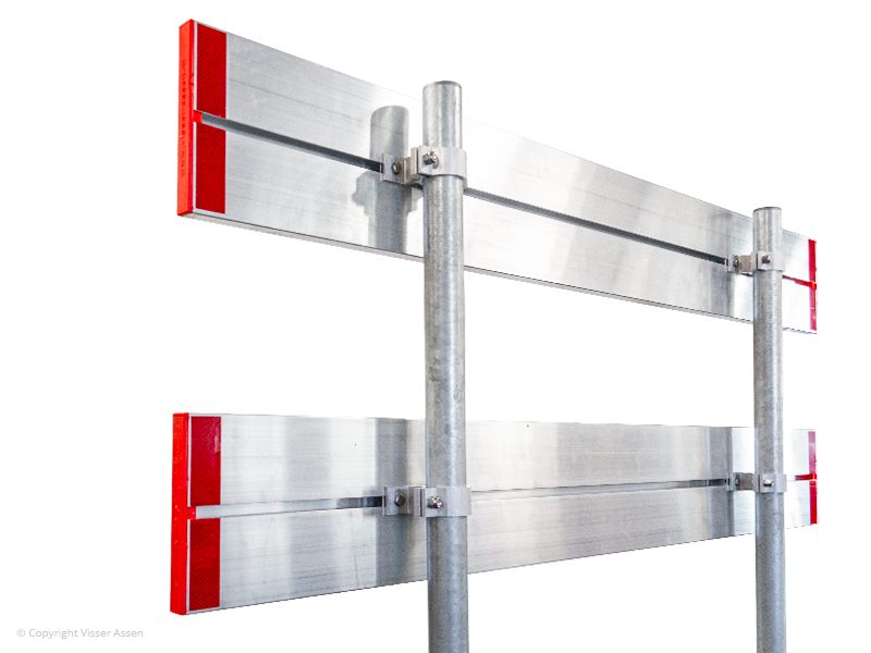 De schrikhekplanken zijn uitgevoerd in robuust aluminium. Dit ijzersterke kokerprofiel is over de gehele lengte voorzien van een sleuf. Hierin kun je eenvoudig de meegeleverde speciale verkeersbordenbeugels klemmen, waarna je de schrikhekplanken gemakkelijk aan de eveneens meegeleverde palen kunt bevestigen. Uiteraard zijn beide uiteinden van de schrikhekplanken voorzien van kunststof einddoppen.