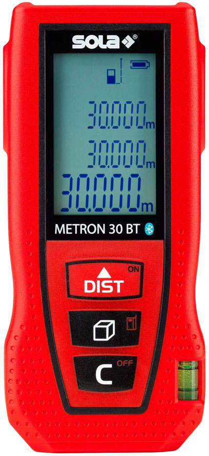 De geïntegreerde waterpas van de Metron 30 BT zorgt voor extra precisie bij het meten, waardoor je altijd de meest nauwkeurige resultaten krijgt. Het display met 3 regels en achtergrondverlichting maakt het gemakkelijk om meetgegevens af te lezen, zelfs bij weinig licht.