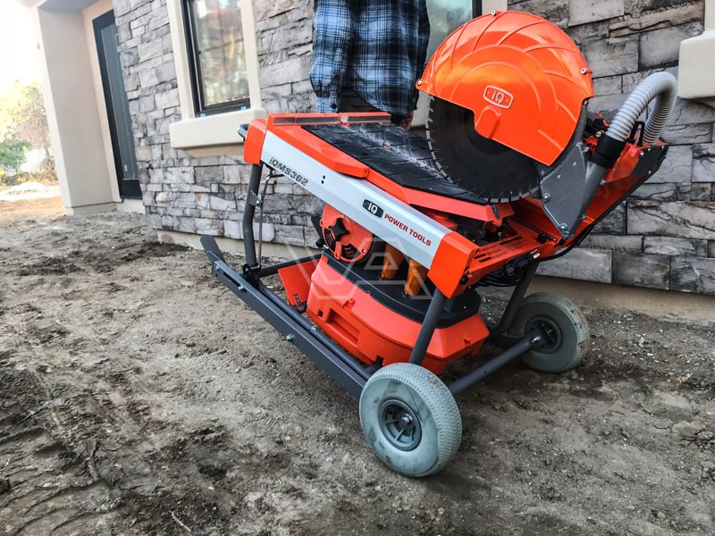 Deze zaagtafel voor het op maat zagen van stenen is uitgerust met een geïntegreerd wielstel. Het wielstel is voorzien van speciale luchtbanden. Hierdoor is het mogelijk de iQMS362i ook op ruw terrein kinderlijk eenvoudig te verplaatsen.
