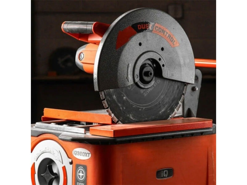 DeiQ360XT kan in zekere zin de compacte uitvoering van de iQMS362 worden genoemd, eveneens een zaagmachine voor stenen van iQ. Deze Amerikaanse fabrikant heeft zich ten doel gesteld een einde te maken aan het nat doorslijpen. Dit is dan ook de reden dat deze zaagmachine voor het zagen van stenen is uitgevoerd met een geïntegreerde stofopvang. Uniek is dat al het vrijgekomen stof wordt opgevangen in een groot stofreservoir. Heeft deze bak meer dan 22 kg aan slijpstof verzameld, dan kun je deze zeer eenvoudig legen.