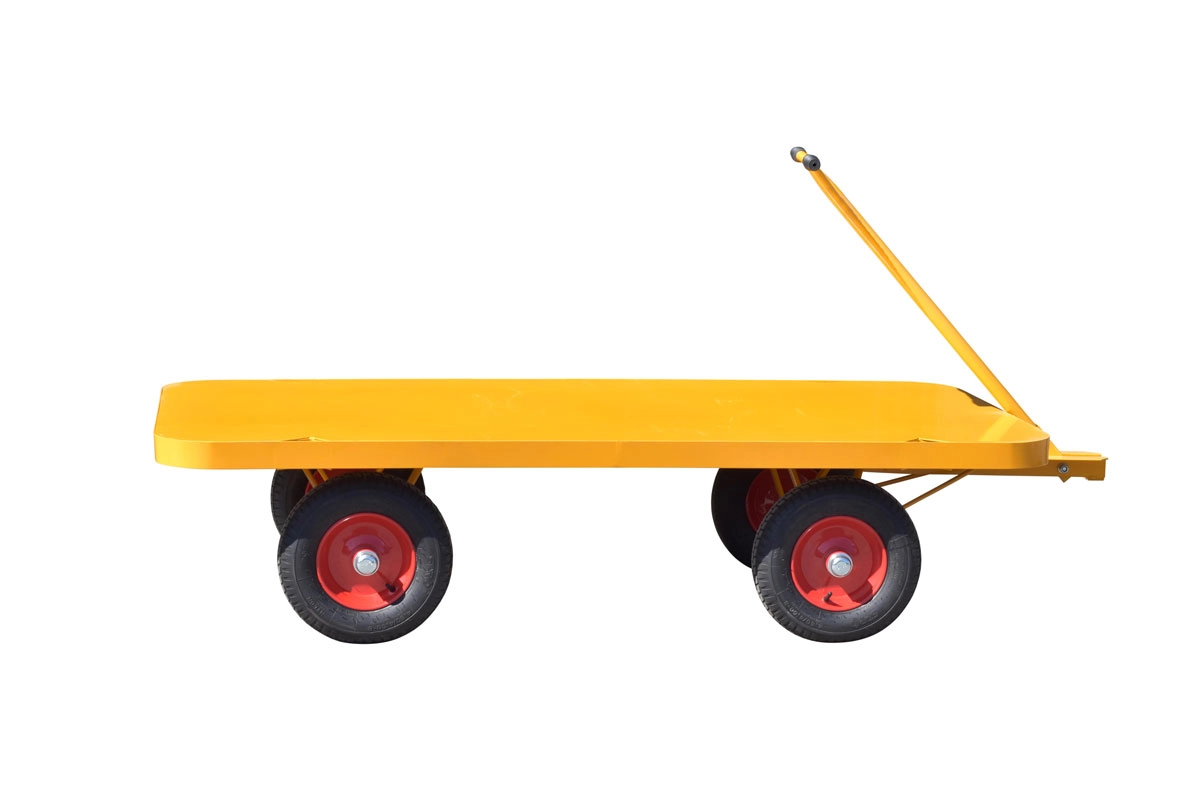 Deze platte kar is het ideale transportmiddel om op de bouw grote en zware lasten snel en gemakkelijk te verplaatsen. Met een laadvlak van maar liefst twee vierkante meter en een indrukwekkend draagvermogen van wel 1200 kilo is deze in narcissengeel gepoederlakte transportwagen onmisbaar op de bouwplaats.