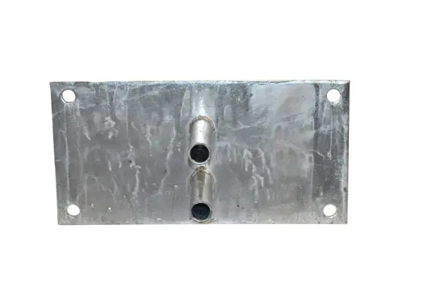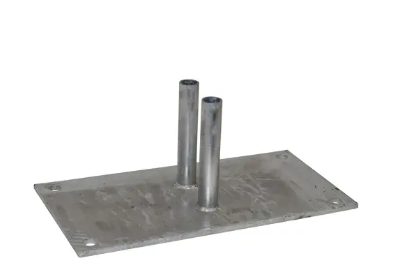Deze speciale voetplaat heeft een groot oppervlak van 500 x 250 mm. De twee aangelaste buisjes hebben een hoogte van 200 millimeter en vallen precies in de buizen van je Heras-bouwhek. Deze voetplaat vormt dus een solide basis en voorkomt het omvallen van het bouwhek.