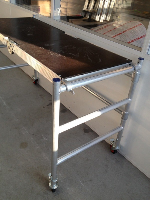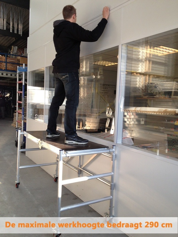 Drie werkhoogtes Zoals al eerder vermeld, kun je met deze steiger in hoogte variëren. Monteer je namelijk het platform op de onderste buizen, dan heb je een werkhoogte van 230 centimeter. Zoek je het liever iets hogerop, dan monteer je ze een trede hoger om een werkhoogte van 260 centimeter te creëren. Wil je nog hoger werken, dan kun je de werkhoogte op maar liefst 290 centimeter instellen.