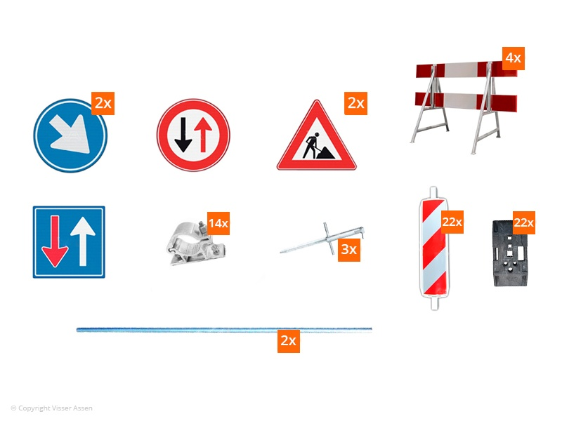Deze wegafzetting compleet wordt geleverd inclusief 22 geleidebakens met baakvoet. Dit figuur 1124a is dan ook geschikt voor de duur van twee uur of langer.