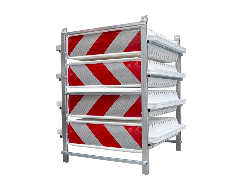 Voor het efficiënt opslaan en verplaatsen van meerdere baakschilden biedt AIC Visser een opslagrek voor 64 geleidebaken. Dit robuuste rek maakt transport met een heftruck of kraan eenvoudig, zonder risico op beschadiging van de reflecterende folie.